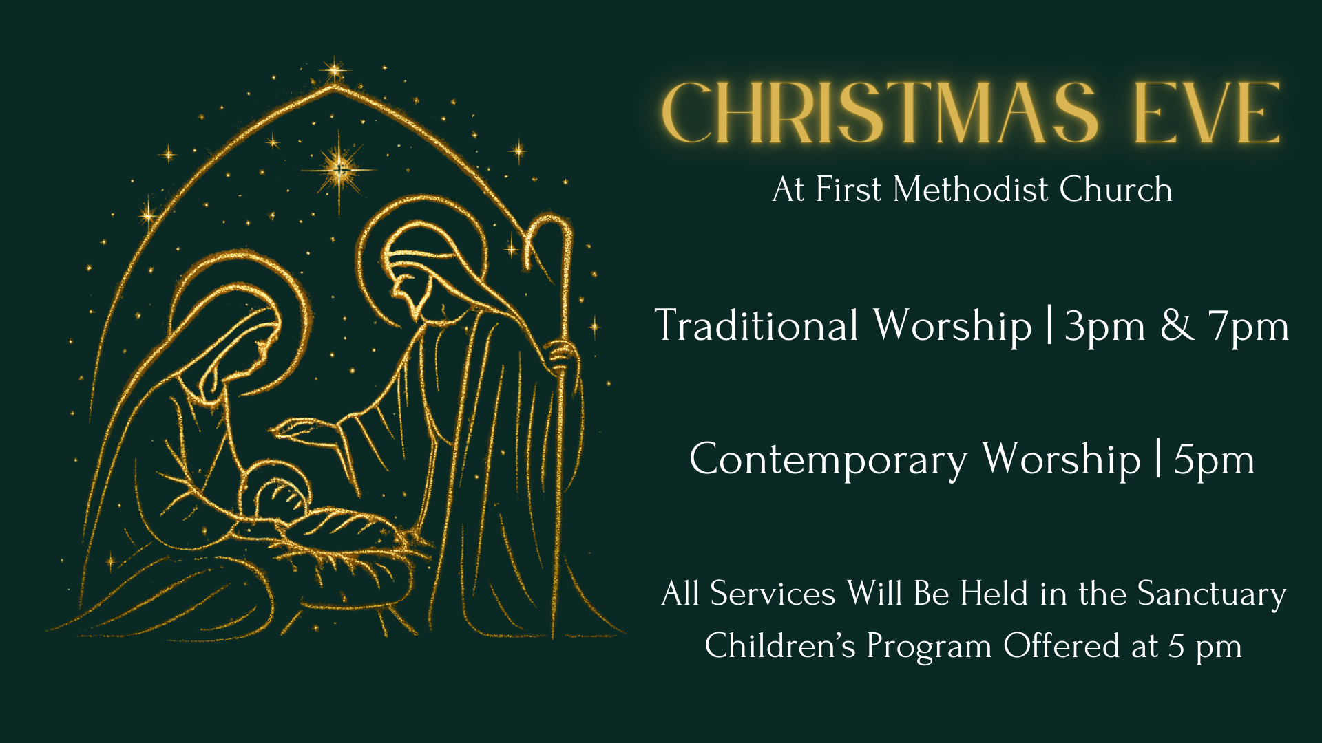 Join us this Christmas Eve at 3, 5, and 7 pm for worship!